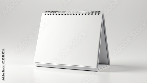rendering of a desk calendar. The calendar is white in color and has a spiral binding on the top. It is standing upright on a white background. The front of the calendar is blank