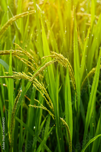 rice, field, farm, plant, green, drop, landscape, organic, harvest, thai, siam, asia, asian, closeup, natural, nature, tropical, morning, food, agriculture