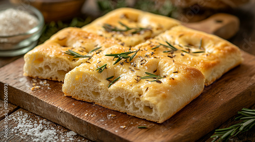 rosemary and sea salt focaccia bread baked fresh food meal herb tasty lunch brown board