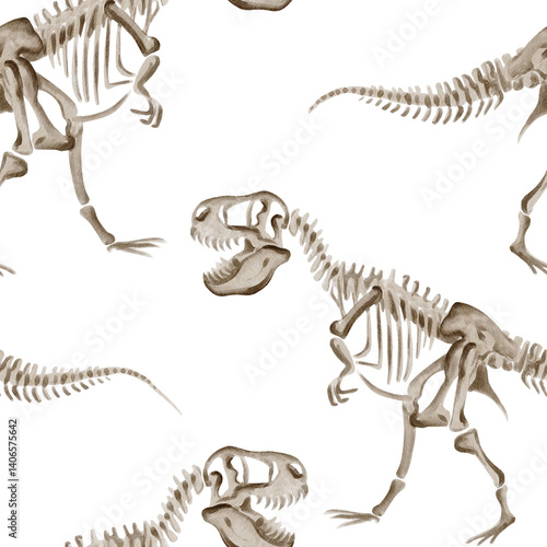 Seamless pattern of theranosaurus rex skeletons. T-Rex watercolor illustration without background. Halloween bones. Hand drawn. For fabric and banners. Jurassic fossils.