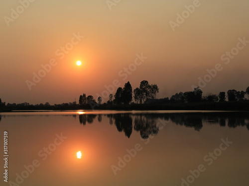 silhouette tree in asia with sunset.Tree silhouetted against a setting sun.Dark tree on open field dramatic sunrise and reflection in water.