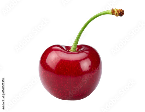Single Cherry with Leaf and Curved Stem, Angled Perspective, Fresh Fruit Concept, Generative AI, isolated on transparent background