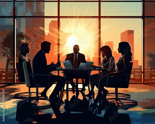 Sunrise business meeting, corporate team discussion, executives in office, cityscape office view Business meeting, sunrise cityscape, office with large windows, reflection on table, silhouette