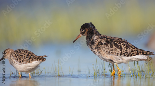 The ruff - pair at wetland on a mating season in spring