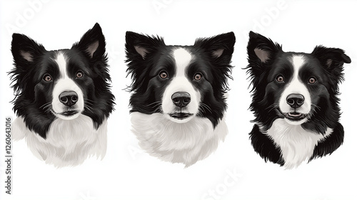 three white and black border collies dogs faces only looking towards forwardq2 isolated on white background
