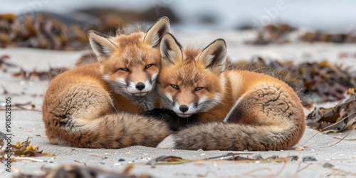Two foxes cuddle together on a beach resting fox in nature sleeping fox blurred background