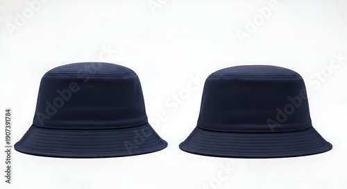 Two Navy Blue Bucket Hats Isolated On White Minimal Apparel Product Display For Fashion And Retail Concept