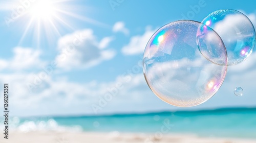 two soap bubbles floating in the air on a beach, with the sun shining brightly in the background and the sky filled with fluffy white clouds The background is slig