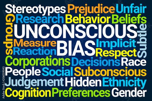 unconscious, bias, prejudice, unfair, social, group, people, race, ethnicity, age, sex, belief, reaction, judgement, psychologist, cognition, study, research, training, corporation, decision, subtile, test, measure, disrespect, subconscious, hidden, behaviour, blue, word, cloud, white, background