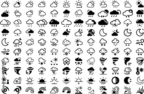 Weather Icons Pack – Monochrome Vector Set: Large set of black glyph weather icons for apps, UI, and print. Sun, clouds, rain, snow, wind, storms, and moon phases. Ideal for dashboards,