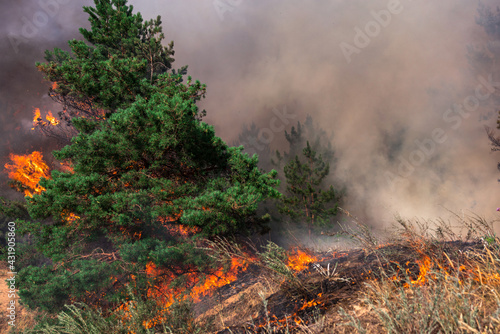 wildfire, burning pine forest .