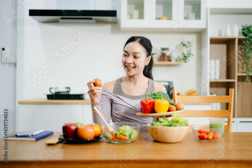 Young female in kitchen and writing down healthy recipe or daily ration diet at home. clean eating concept.
