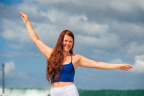 woman, sea, ocean, beach, female, girl, happy, free, freedom, carefree, feeling, healthy, sport, smiling, cheerful, red hair, pretty, beautiful, attractive, portrait, fun, enjoying, relaxed, excited, holiday, blue, sky, tropical, island, destination, travel, wellness, alone, looking, background, beauty, nature, natural, fresh, water, isolated, arm, spreading, sunny, sun