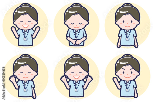 woman, adult, occupation, nurse, welfare, helper, care, staff, nursing home, waist up, front, smile, joyful, fun, happy, positive, happy, enjoyment, positive, light, lively, bow, courteous, greeting, gratitude, regard, payback, apology, expression, feeling, icon, pose, sweet, people, set