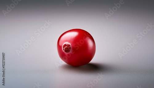 無地の背景に、赤いクランベリーの実が1つ置かれており、その小さな実が鮮やかで深みのある色合いを持っています。テクスチャは柔らかな質感とジューシーさが強調され、冬の果物らしい温かみを感じさせます。
