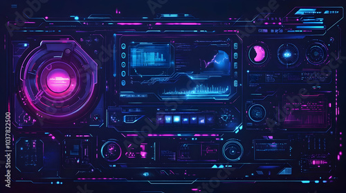 1. A cutting-edge digital technology interface characterized by blue and purple hues, emphasizing an abstract design.