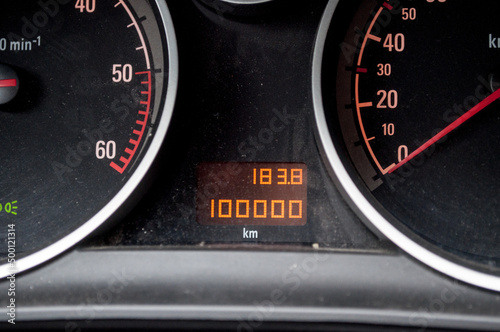 100 000 km in car. Speedometer in a car with a mileage indicator.