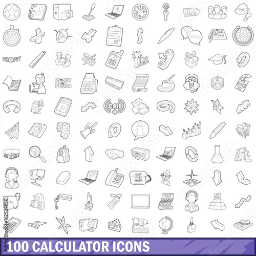 100 calculator icons set, outline style