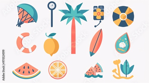 minimalist, geometric, summer, icon, set, holiday, beach, element, boat, surfboard, watermelon, lemon, seashell, photo, camera, palm, tree, all, vibrant, colours, clean, white, background