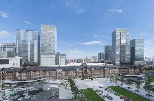 tokyo station, station, square, green, summer, blue skies, sunny, economic, building, highrise, business building, business, sky, tokyo, building, city, office, city centre, big city, image, japan, asia, metropolitan, property, landscape, tour tourism, travel, tour, showplace, symbol, transportation, rail