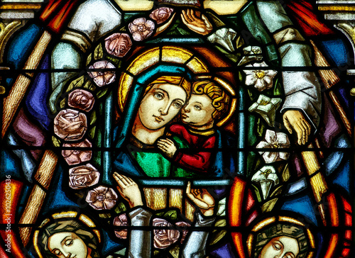 2024-08-01, Paris, FRANCE. Stained glass of Blessed Virgin Mary holding baby Jesus Christ in her arms. .
