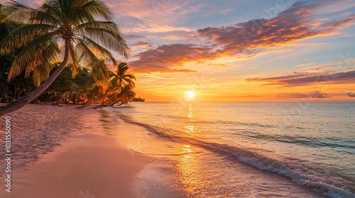 2408 99.A peaceful beach at sunset, with palm trees lining the horizon under a vibrant orange sky. The warm glow of the setting sun reflects on the calm ocean, creating a relaxing, tropical