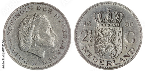 2,5 gulden1980 coin isolated on white background, Netherlands