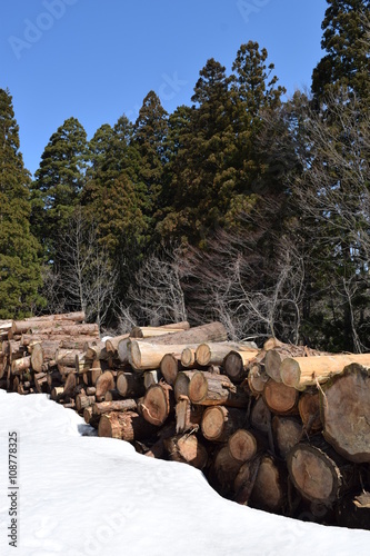 丸太の雪解け/昨年の秋に伐採され、約2mの雪の中に隠れてしまった丸太ですが、春になり雪が解けて見えてきた、杉の丸太を撮影した写真です。
