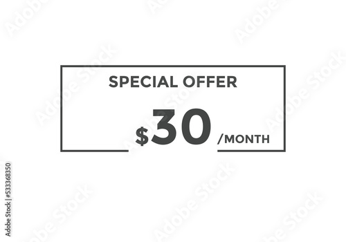 $30 USD Dollar Month sale promotion Banner. Special offer, 30 dollar month price tag, shop now button. Business or shopping promotion marketing concept