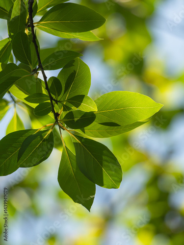 foliage, leaf, sky, up, light, shiny, plant, nature, forest, wood, green, yellow, blue, beauty, season, spring, outdoors, light, sunlight