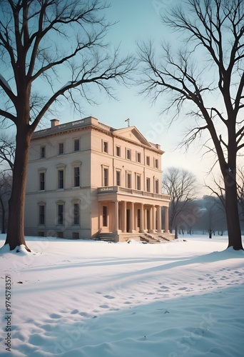 35mm film photography, A snowy winter scene with a neoclassical style building in the background, surrounded by a snow-draped stone wall, bare trees in the foreground, a bright clear sky with the sun