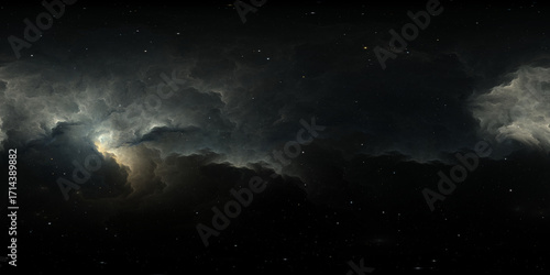 360 degree space nebula. Giant interstellar cloud with stars, equirectangular projection, environment map. Spherical panorama. 3D rendering, Fractal image