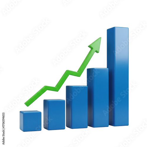 three-dimensional, bar, chart, financial, growth, upward, trend, arrow, business, success, economy, progress, datum, visualisation, statistic, profit, investment, report, market, gain, performance, increase, revenue, positive, concept, digital, abstract, diagram