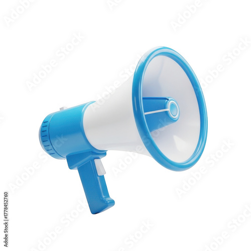 three-dimensional, megaphone, announcer, speaker, communication, alert, sound, blue, white, object, isolated, on, transparent, background, realistic, render, clean, design, commercial, use, stock, image, graphic, element, promotional, warning, vintage, retro, device