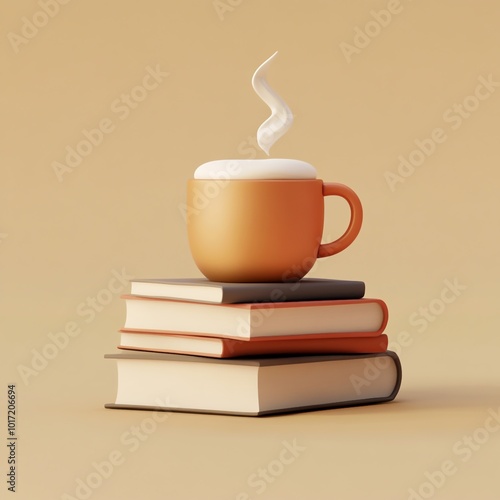 3D Book Stack with Coffee Icon: Literature and Relaxation Illustration Logo