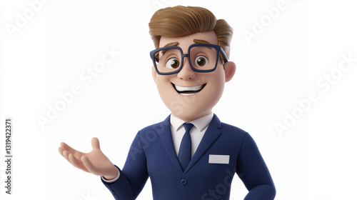 3D character in suit with glasses, smiling and gesturing confidently. Ideal for business or marketing themes
