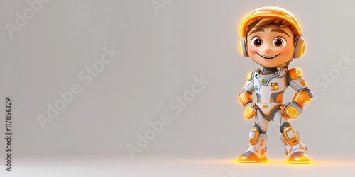astronaut, character, cheerful, three-dimensional, animation, bright, futuristic, helmet, orange, suit, smiling, digital, artwork, design, playful, children, space, adventure, technology, imagination, friendly, standing, glowing, casual attire, cool, vibrant, young, exploration, boy, cartoon, light, fantasy, fun, creativity, motion, playtime, children, hero, journey, unique, artistic, colourful, minimal