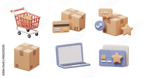 three-dimensional, icon, set, e-business, online, shopping, retail, store, cart, checkout, delivery, box, parcel, package, credit, card, payment, transaction, buy, sell, order, shipping, marketing, laptop, computer, screen, review, rating, star, client, feedback, business, creative, graphic, app, tablet, swatch, isolated, tool, element