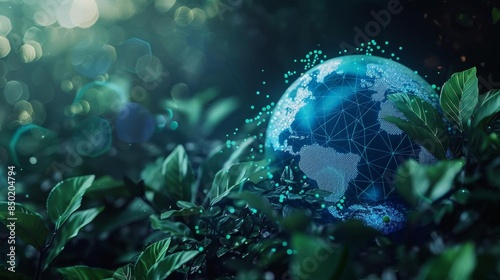 3D Environment Day themed tech scene of a 3d Globe in a dark blue and cyan themed digital blockchain themed ecosystem, surround by few green leaves, minimal