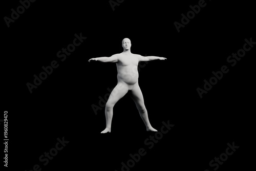 man, male, body, figure, portrait, person, weight, obesity, health, anatomy, isolated, studio, expression, confidence, strength, acceptance, challenge, awareness, lifestyle, well-being, diversity, human, form, presence, individuality, posing, vulnerable, three-dimensional, render, model, digital, art, photorealistic, mannequin, left, masculine, overweight, heavy, large, matte, flat, black, dark, background, lighting, clean, illustration, character