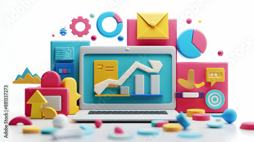 3D Flat Icon of Individual with Laptop and Marketing Automation Icons, Concept of Marketing Automation Strategy with Copy Space, Isolated on White Background