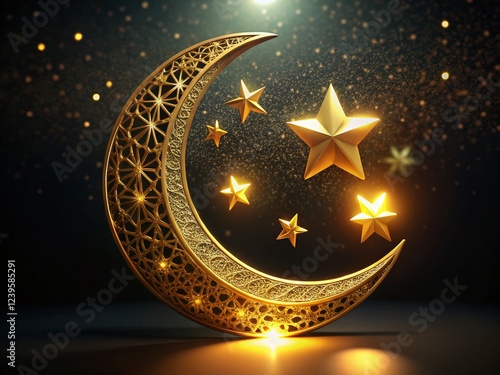 3D Golden Crescent Moon with Stars on Black Background for Ramadan Kareem Celebration Greeting Card