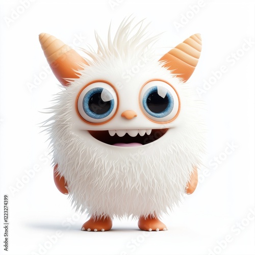 3D icon cartoon of a fluffy monster with big round eyes and a cheerful grin, isolated on a white background
