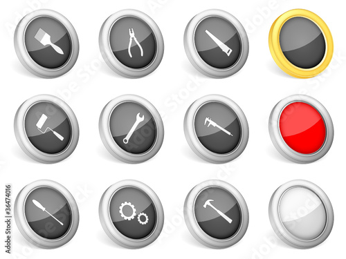 computer, buttons, icon, symbol, cyberspace, tool, repair, connection, technology, equipment, circle, signs, design, vector, illustration, white, black, grey, element, work, plier, gear, saw, hammer, paint, roller, brush, spanner, wrench, screwdriver, construction, instrument, caliper, three-dimensional, set, object, click, shape