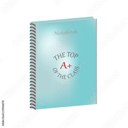 3d illustration, isometry. Notebook with inscription the top of the class A+ grade. Realistic vector element for design, school theme. Excellent rating, maximum score.