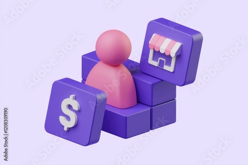 three-dimensional, illustration, person, dollar, signs, shop, online, business, e-business, purple, pink, cube, block, money, sale, retail, marketing, commerce, digital, shop front, client, user, transaction, payment, finance, economy, website, app, technology, graphic, design, model, rendering, abstract, concept, symbol, icon
