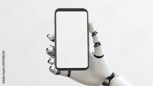 3D illustration of a robotic hand holding a mobile phone with a blank screen, isolated on a white background.