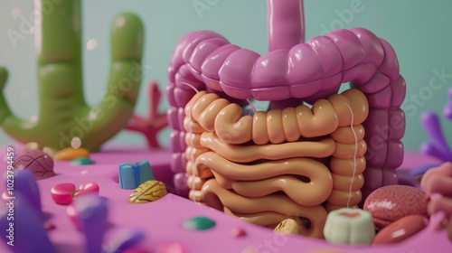 3D illustration of the human digestive system and microbiome. A detailed 3D-rendered illustration of the human digestive system, highlighting the intestines and microbiome
