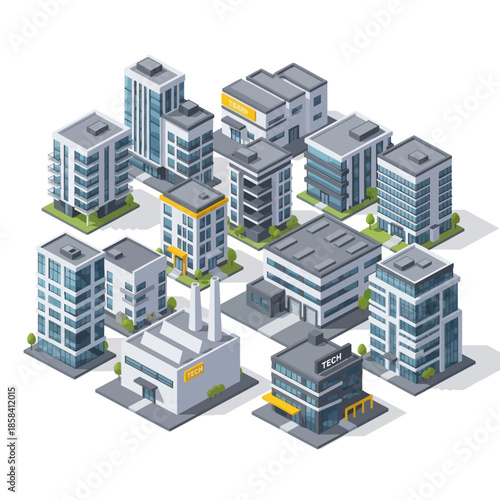 3D Isometric Cityscape with Modern Buildings.