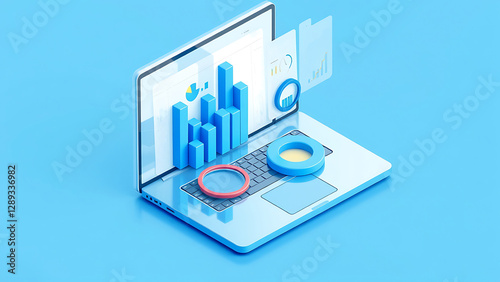 3D isometric digital business analytics dashboard with charts, graphs, and financial data on a blue background for technology and finance